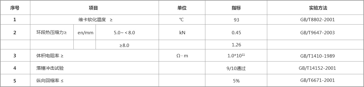 PVC-C樹脂為母料,該產(chǎn)品具有強度高、柔韌性好、耐高溫、耐腐蝕、阻燃、絕綠性能良好、不易老化、質(zhì)輕、施工方便等特點,其各項性能指標經(jīng)國家級、省檢測、鑒定和認證,均已達到或超過國內(nèi)的同類產(chǎn)品水平。產(chǎn)品性能大優(yōu)于傳統(tǒng)的石棉電纜排管及普通PVC管材,是傳統(tǒng)電力電纜護套管的理想替代品。